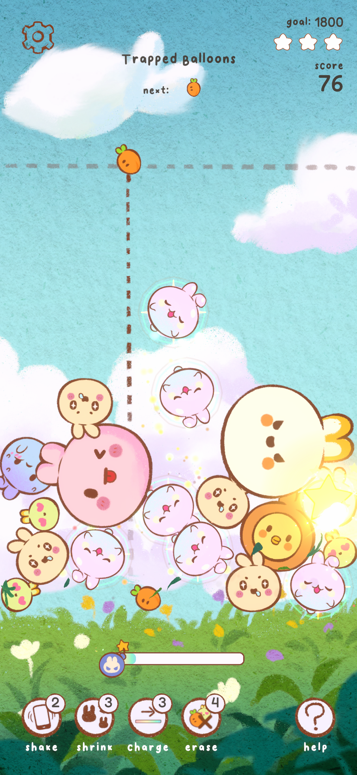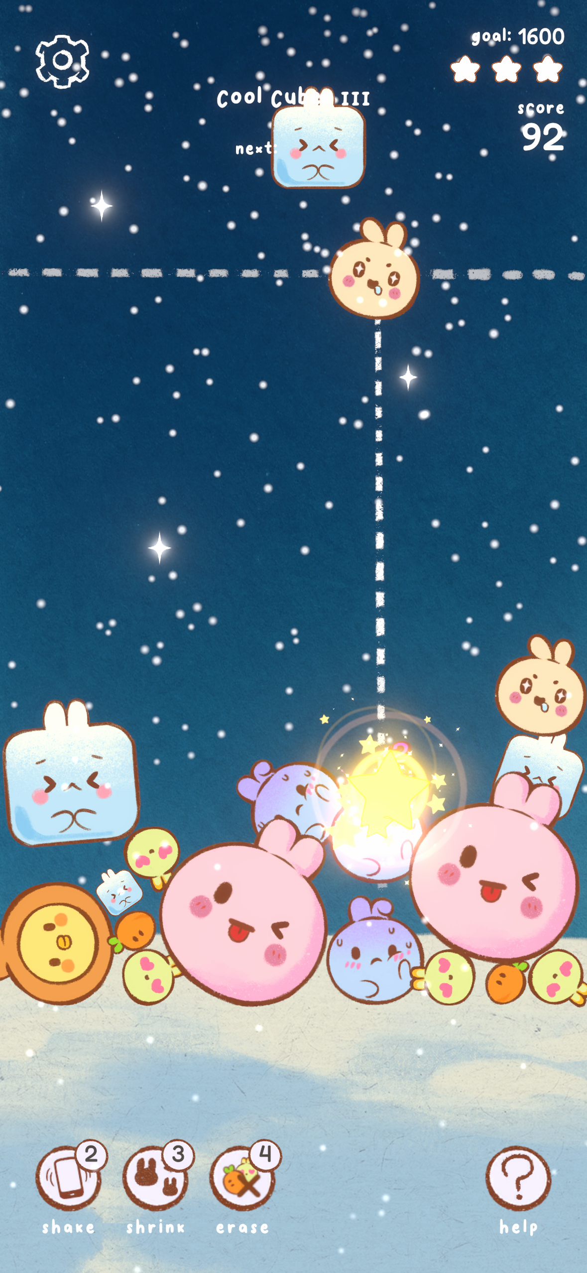 Mechanics that meshed well with PPB's physics-based identity would all be quite effective: bunny mass, bunny shape, physics forces, and collisions. A successful example of this was the Ice Cube Bunny. This was a special bunny that would sometimes spawn and not be mergeable with any other bunny, effectively serving as a moving obstacle that could be placed by the player. Over time, it would get smaller and smaller until it disappeared. The ability to choose where to put it and its predictable behavior of shrinking made it an interesting challenge of how well a player could manage the obstacle instead of feeling unfair.