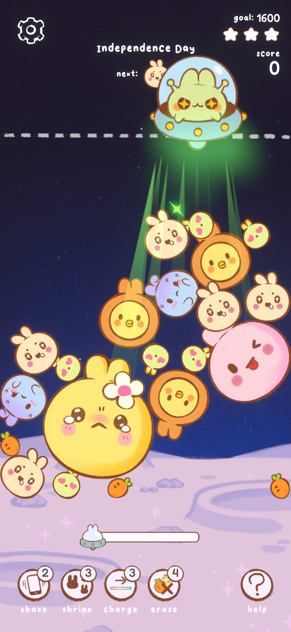 I created powerups that could be activated in-game. Undo which could rewind time and correct a mistake. Boom which could cause a bunny to explode and jiggle the board for those "they're so close to touching!" moments, as well as remove bunnies from the board instead of merging into a new one. To achieve the board jiggling effect and make the explosion feel satisfying, I made the explosion apply an entirely unrealistic upward force on the surrounding bunnies.